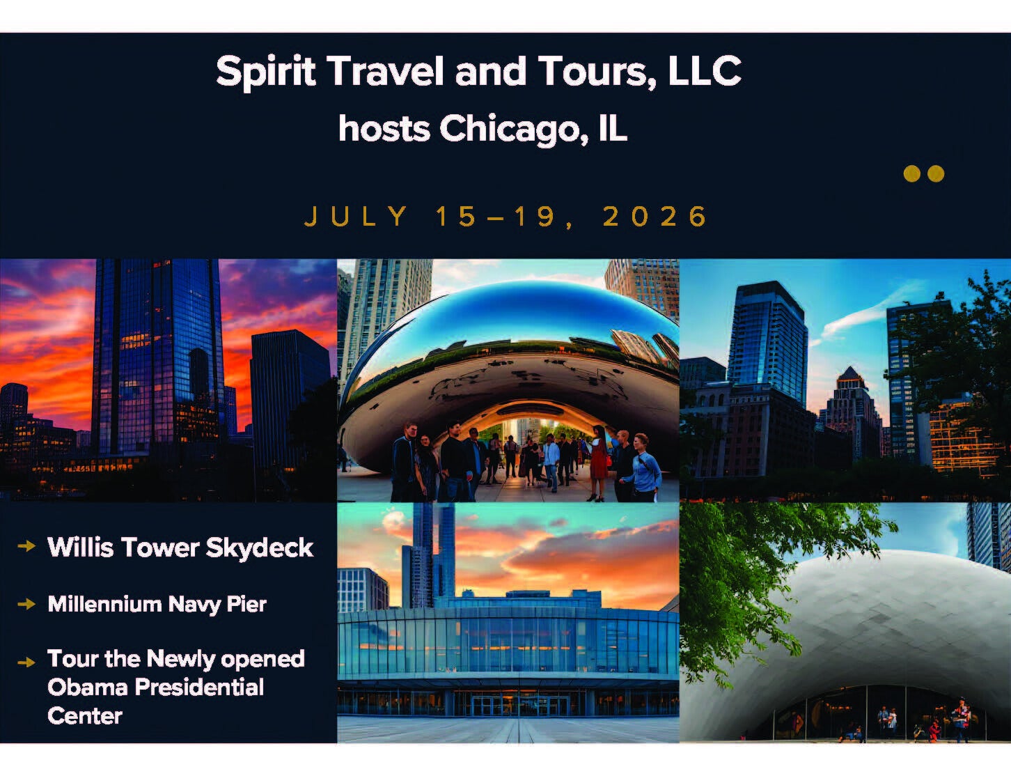 We invite you to join us for an amazing trip to Chicago, IL. Enjoy time at the Navy Pier; shopping and dining on the Magnificent Mile; and touring the newly opened Obama Presidential Center.
